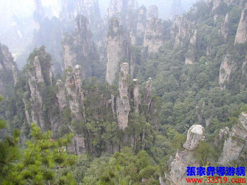 (神兵聚會)從仙人橋去老屋場,但見深谷里密密麻麻羅列上百座石峰,活像一群威武雄壯的將士列隊聽令,相傳這就是向王天子的神兵在聚會。神話雖不可靠,但石峰如此集中壯觀,在武陵源也屬罕見。我想引用一位美術(shù)大師的話:“豈有此理,莫名奇妙,說也不信,到此方知。”不看神兵聚會,怎知石峰成林。